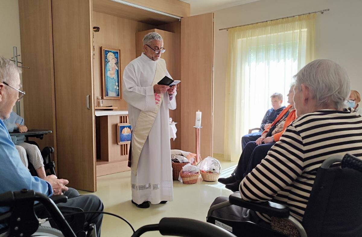 Naše delo se je nadaljevalo . Na začetku je bilo nekoliko manj varovancev a se je prostor, kjer imamo srečanja in bogoslužje počasi polnil. Danes je soba zopet večkrat polna – vsa zasedena. Ob sredah se z Darjo najprej posvetiva sobi – bogoslužnemu prostoru – stoli, mize , cvetje, sveče, oltar, voda, prti… Tudi v recepciji nama povedo določene stvari in kateri si želijo udeležtiti srečanja. Nato se podava  po sobah do varovancev. Mnogi so na vozičkih ali si pomagaj s hodalicami. Najina pomoč je še kako potrebna. Nekateri imajo težave z orentacijo ali se celo bojijo vožnje z dvigalom. Z gotovostjo vam potrdim, da prav vsi se razveselijo, ker vedo ,da gredo k bogoslužju, kjer se bodo srečali z Jezusom.